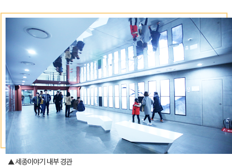 높게 선 이순신 동상과 함께 광화문 광장을 상징하는 황금 세종대왕 동상 뒤에는 전시시설로 들어갈 수 있는 입구가 있다. 계단을 따라 내려가면 ‘이런 공간이 있었나?’ 싶을 정도로 거대한 지하 공간에 세종대왕의 생애와 업적을 담은 전시관 ‘세종이야기’와 충무공 이순신의 공로를 담은 ‘충무공이야기’가 무료로 시민들에게 개방돼 있다.