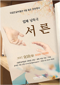입체 낭독극 <서른>의 낭독을 맡은 ‘도킹프로젝트’는 다양한 단체의 연극인들이 함께하는 단체로 지난 몇 년간 양귀자, 김영하, 성석제 등의 한국 현대 문학 작품과 연극의 만남을 소개해왔다. 더불어 공연을 마친 뒤에는 배우들과 작품에 대해 자유롭게 의견을 나누는 자리도 마련된다. 공연은 9월 18일 오전 11시 국립한글박물관 지하 1층에서 열리며 취학아동 이상 누구나 관람 가능하다.