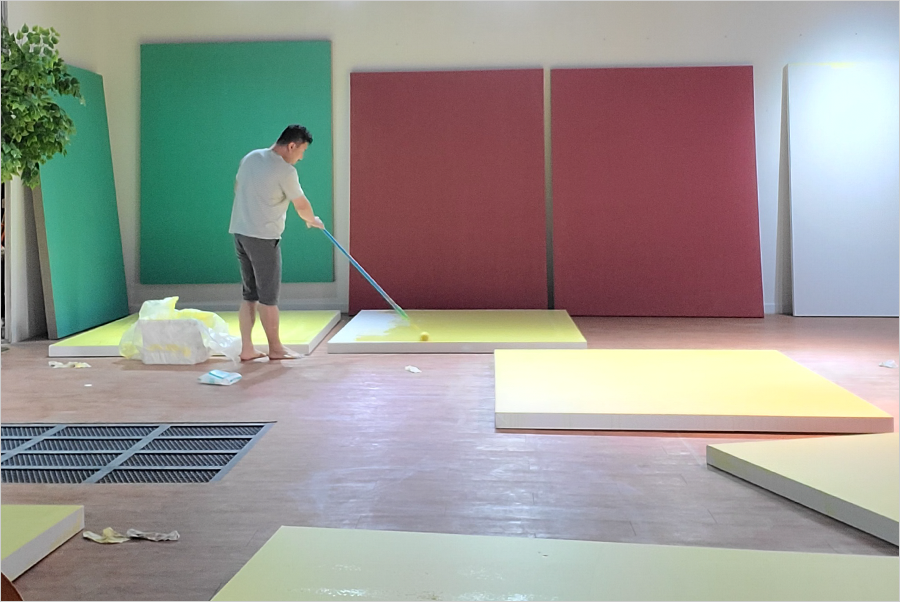 한글을 윷놀이처럼 공중에 투척하여 회전한 이미지를 상상으로 정지시킨 다음 캔버스에 올린 ‘윷놀이 작업’을 한 적이 있었습니다. 그때까지는 별다른 문제가 없었는데, 해외 관객들의 해체된 자음과 모음 하나하나의 뜻과 의미에 대해 질문할 때 답변하지 못했습니다. 오랫동안 가슴에서 풀지 못한, 소화되지 않은 채로 살았습니다. ‘산’이라는 단어와 의미는 알고 있습니다. 하지만 ‘ㅅ’, ‘ㅏ’, ‘ㄴ’의 개별적 의미에 대해 알고 있진 못합니다. ‘분명 의미가 있지만 기록되지 않았거나 지나쳐 버렸다’라고 저를 다독이며 위로했습니다.